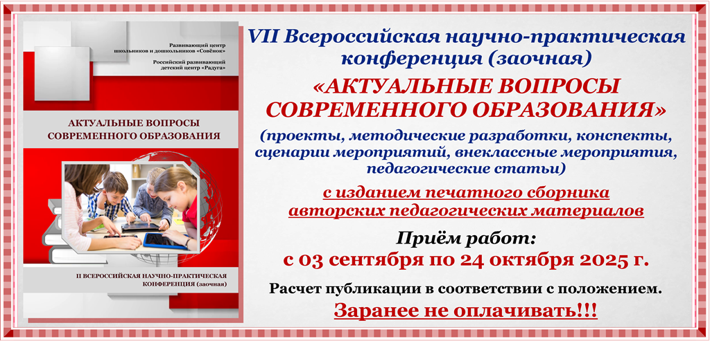 ЗАЯВКА для участия в VII Всероссийской научно-практической конференции "АКТУАЛЬНЫЕ ВОПРОСЫ СОВРЕМЕННОГО ОБРАЗОВАНИЯ" с изданием сборника статей (печатного) >> СКАЧАТЬ
