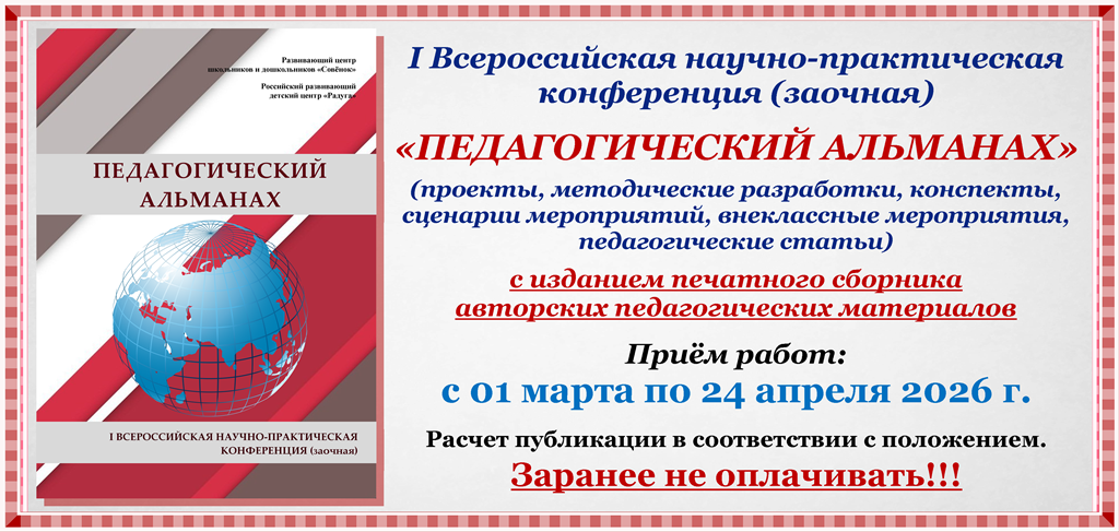 ЗАЯВКА для участия в I Всероссийской научно-практической конференции "ПЕДАГОГИЧЕСКИЙ АЛЬМАНАХ" с изданием печатного сборника статей >> СКАЧАТЬ